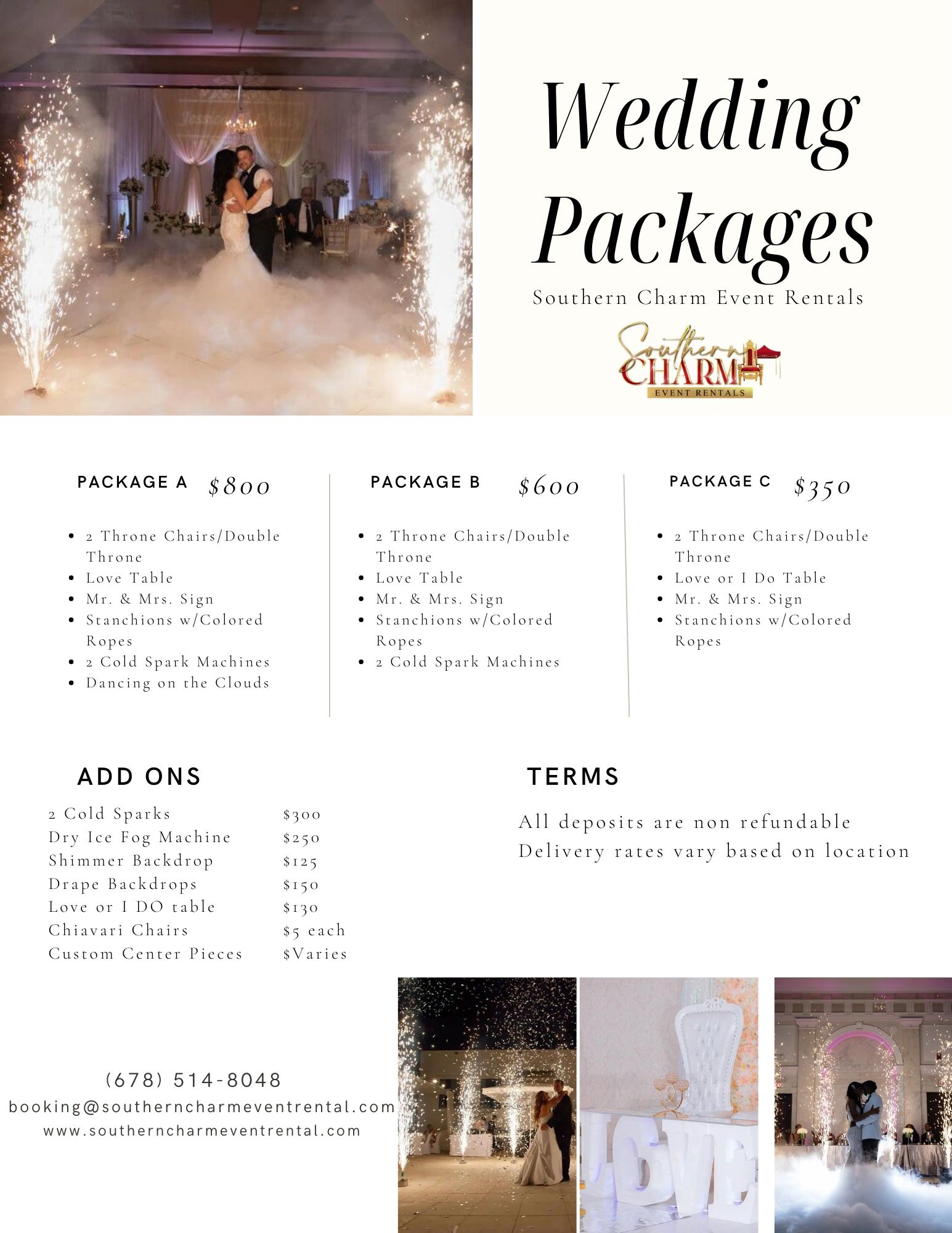 We have what you need for a memorable event! We rent throne chairs, cold spark machines, dry ice fog machines, and more.